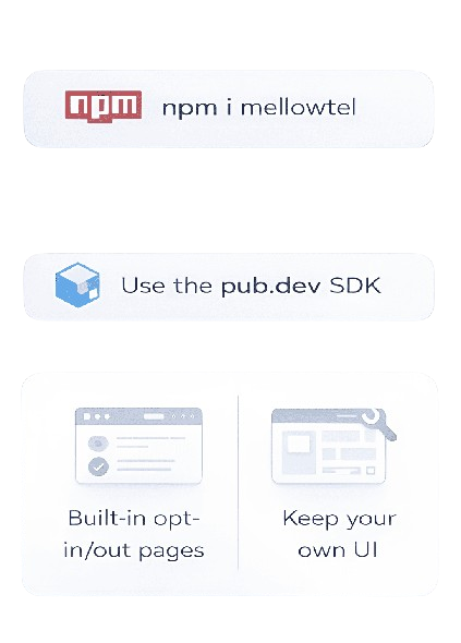 Install the NPM package with "npm i mellowtel" or use the pub.dev package in your product. Then copy/paste 7 lines of code to start earning with Mellowtel